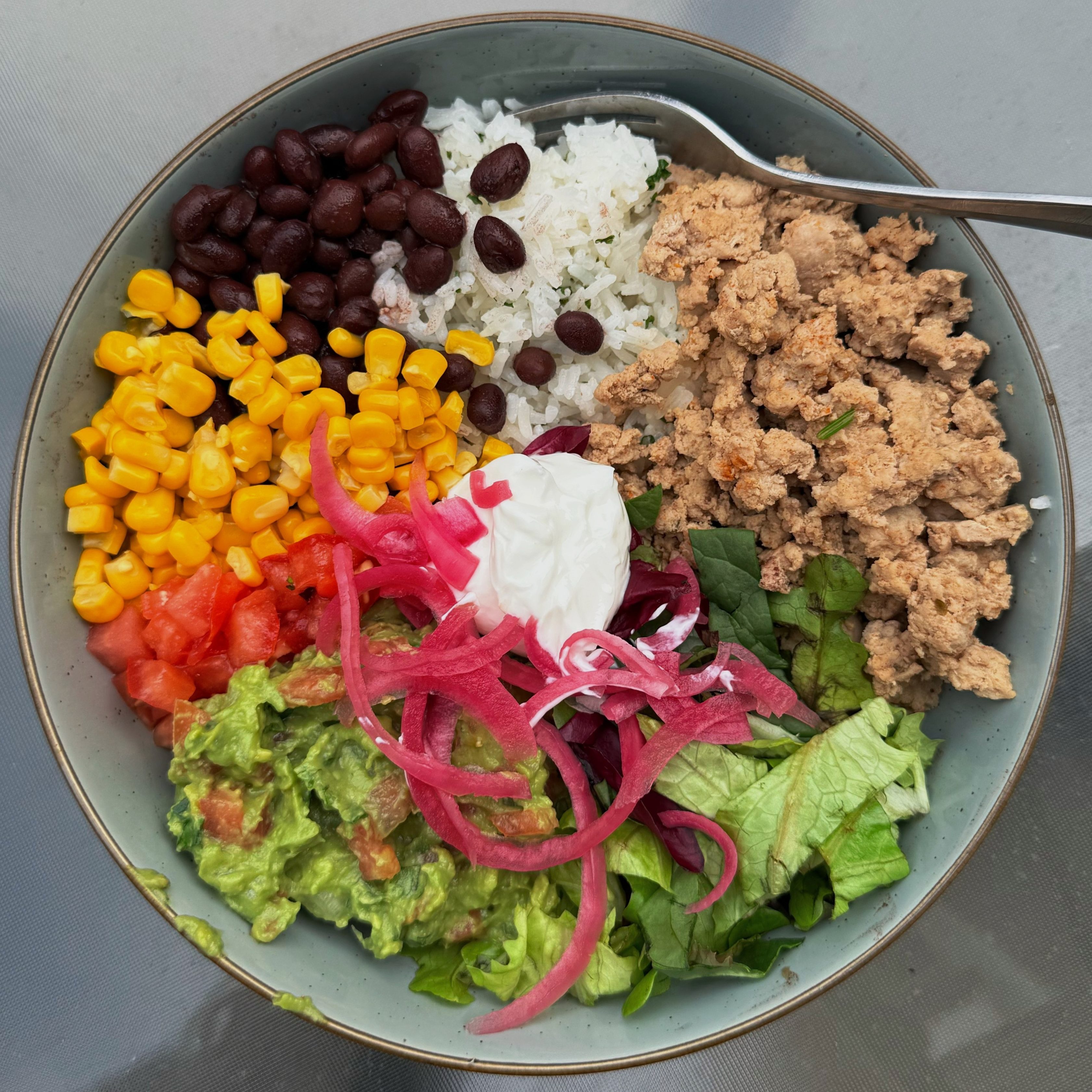 tip/notes: this is one of my fav meal preps- i put all the cold toppings in one tupperware and the rice and turkey in another to heat up. hits every time!