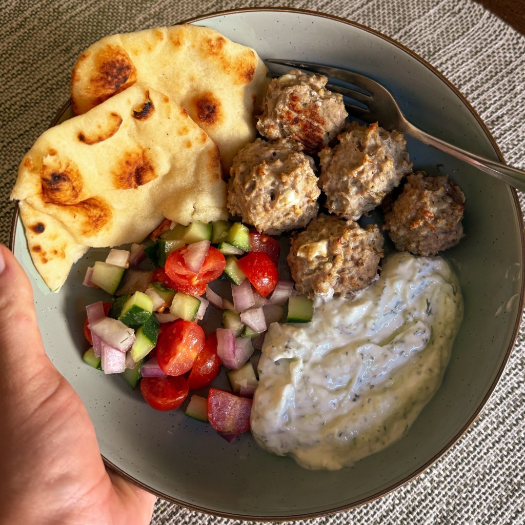 this is for just the meatballs! with the mini naan from costco, 1/3 cup tzatziki, and 1/3 cup shirazi salad you can make a more rounded meal: 502 cals, 20g fat, 40g carbs, and 45g protein!